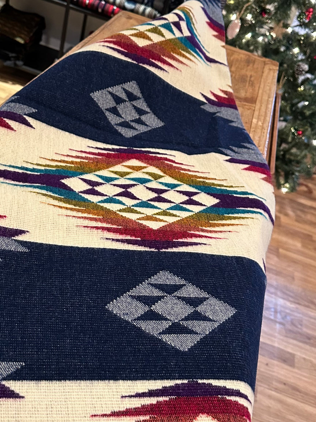 This blanket is crafted by artisans from the Kichwa community in Peguche, Ecuador. Its soft fabric creates a luxurious cocoon of comfort, #NativeMadeNotNativeInspired. Its versatility allows it to be used both as a stylish accent and a comforting companion.