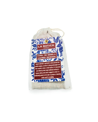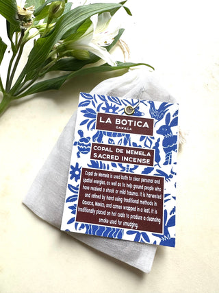 Copal de Memela is used to both clear personal and spatial energies, as well as to help ground people who have received mild trauma. It is harvested and refined by hand using traditional methods in Oaxaca Mexico, and comes wrapped in a leaf. It is traditional placed on hot coals to produce a cleansing smoke used for smudging