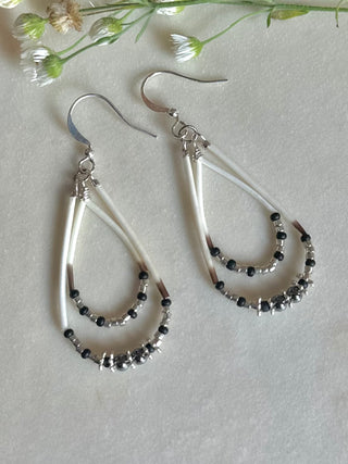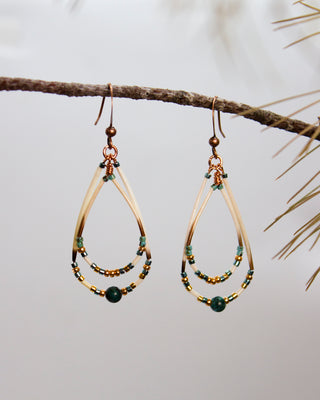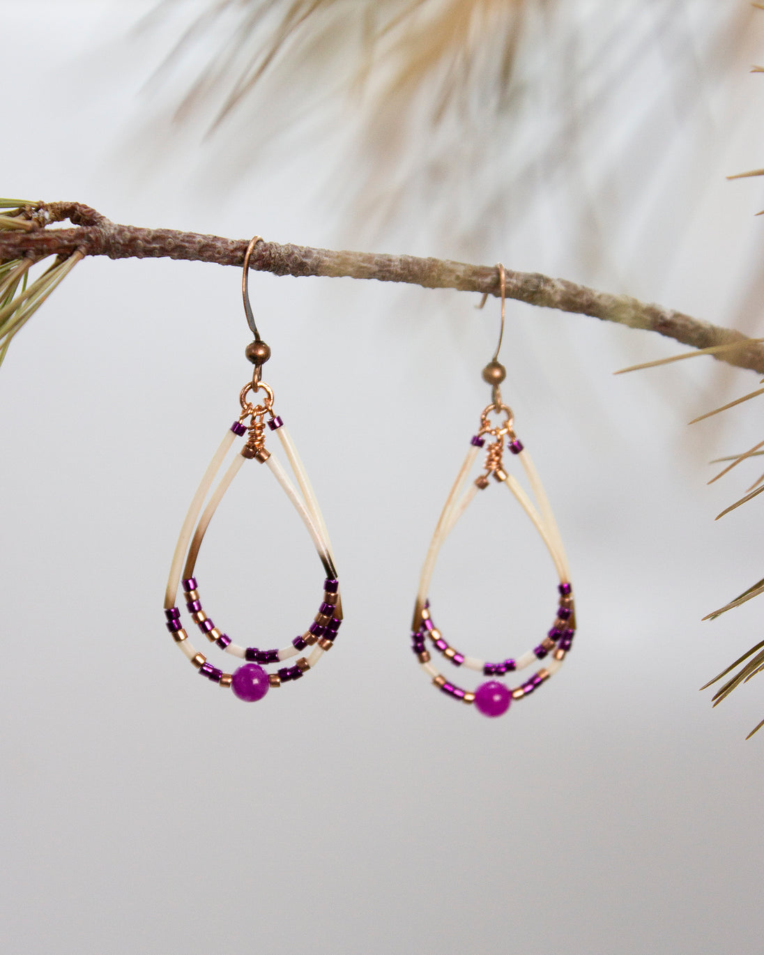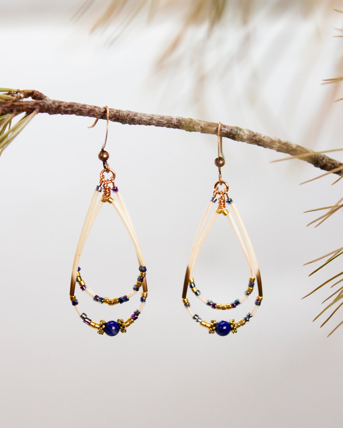 Materials: Porcupine Quill, Size 11/15 Czech and Japanese Miyuki Beads, Silver Plaited Wire, Copper Wire, Surgical Steel Hooks, Turquoise, Hematite, Apatite, Amethyst, Malachite, Lapis-lazuli.
