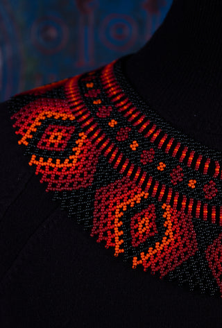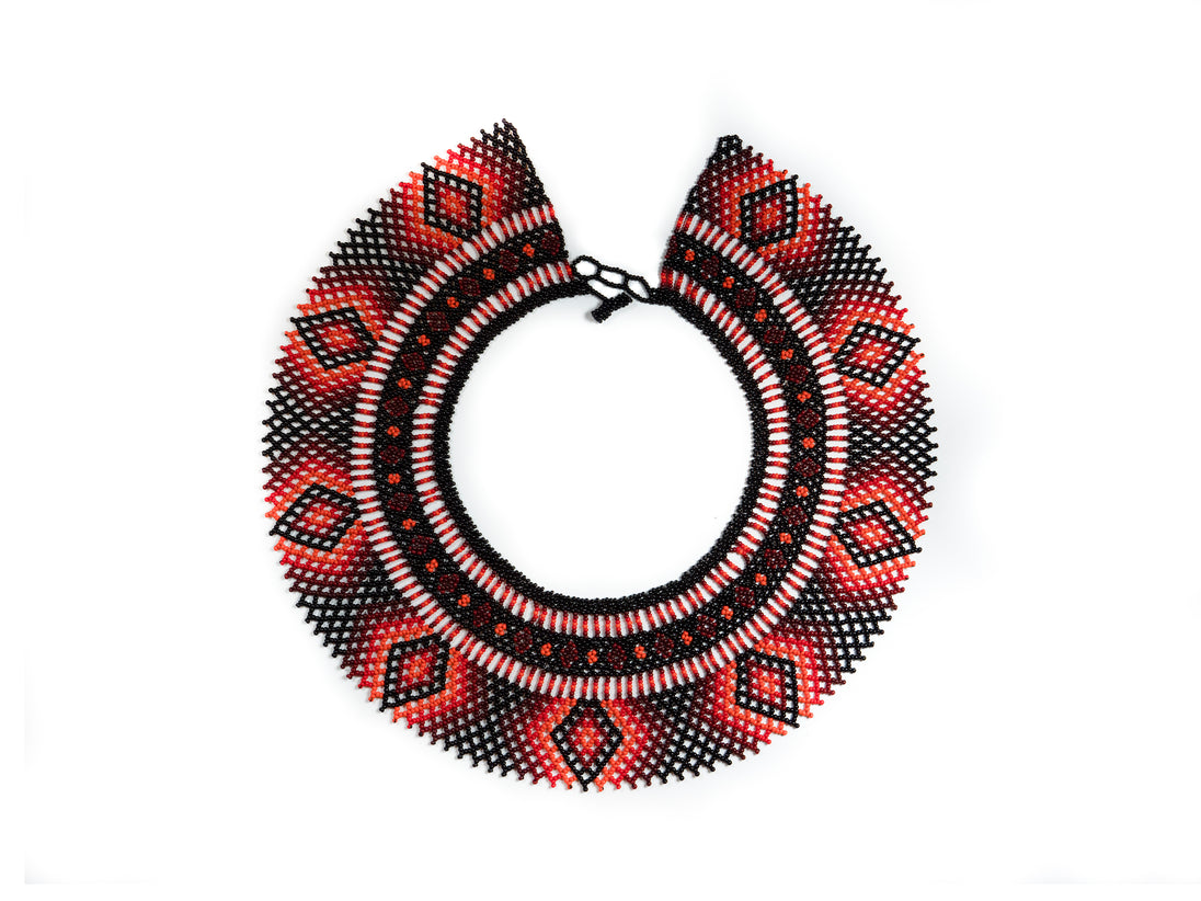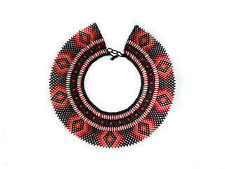 This product was made in Saraguro, Ecuador, by kichwa women who wear traditional necklaces in similar shape, but make new contemporary designs, advancing an indigenous aesthetic into something more modern.