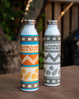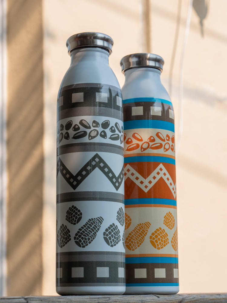 It also represents the connection of Northern and Southern Indigenous communities. Today, beans and corn grow all around the Americas. This pattern tells a story about Tostado (toasted corn), Porotos (beans), Choclo (cooked corn) and how these foods traveled through the mountains (the zigzags) and the rivers (blue lines and squares).
