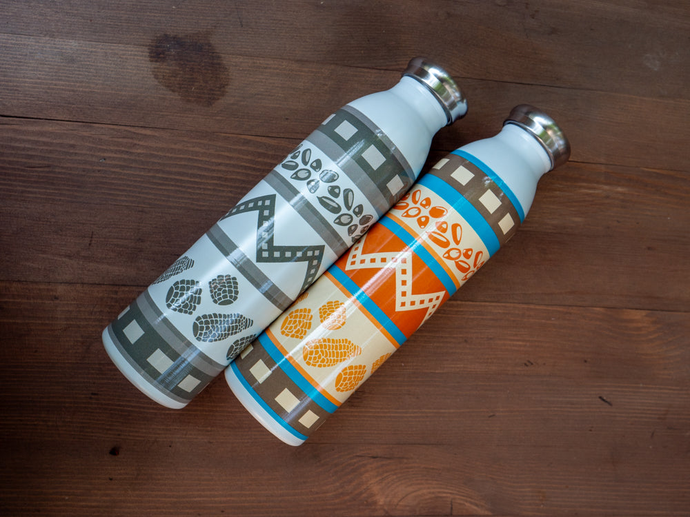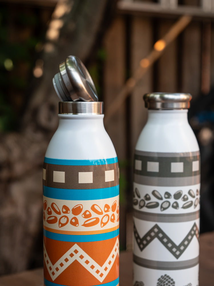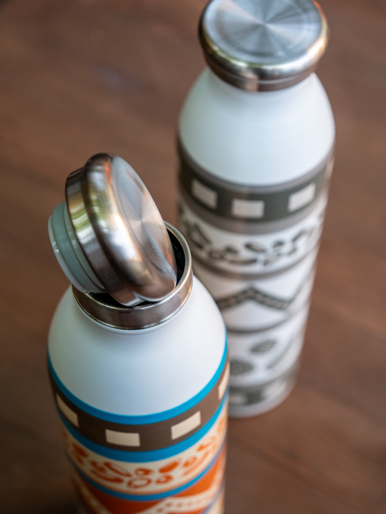 Double-walled stainless steel frame with matte finish, vacuum sealed, silver stainless steel cap.
