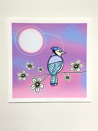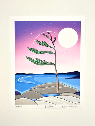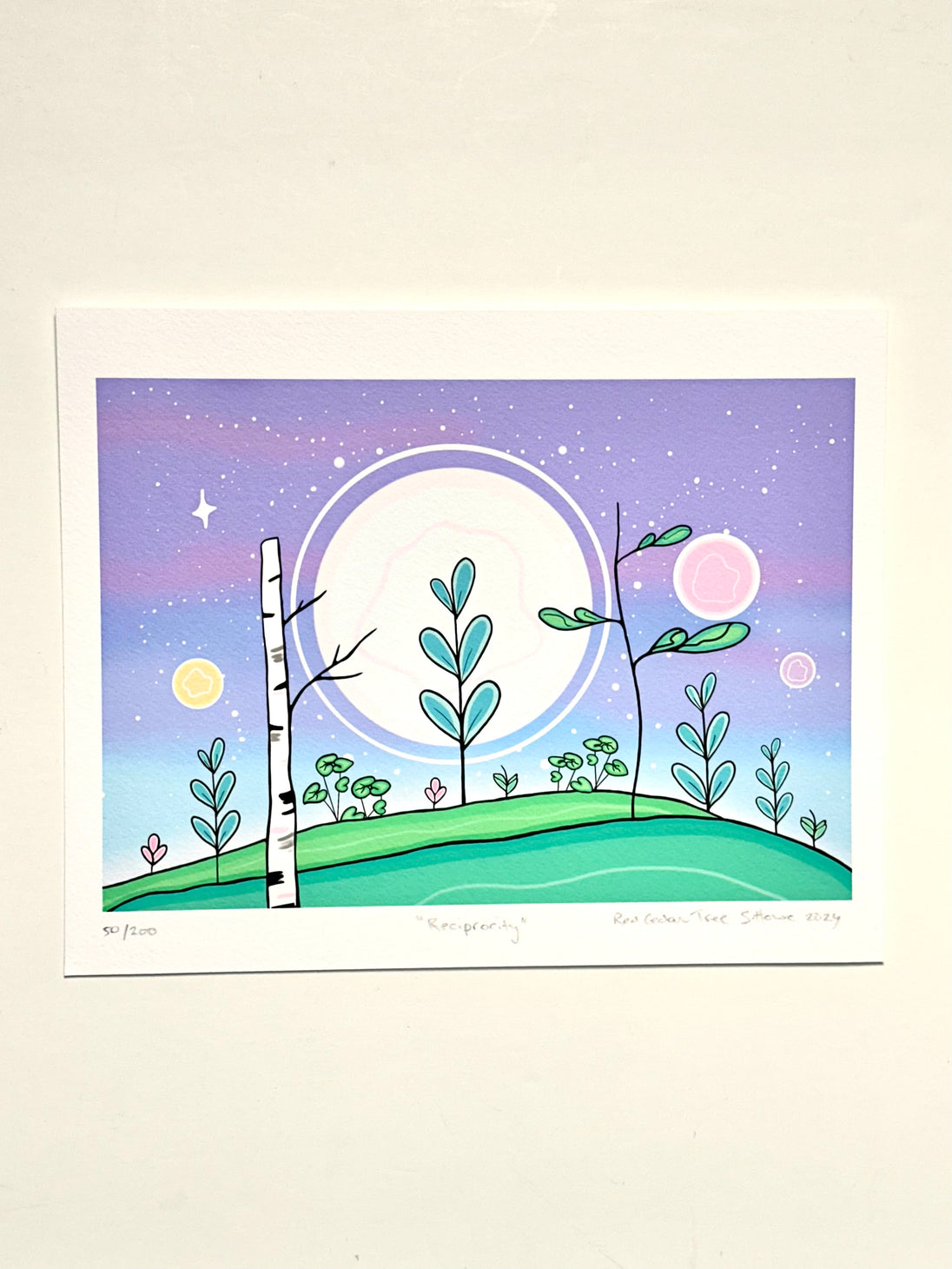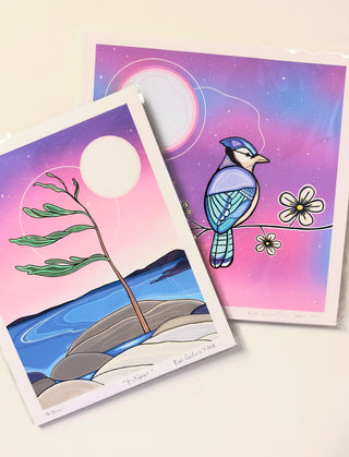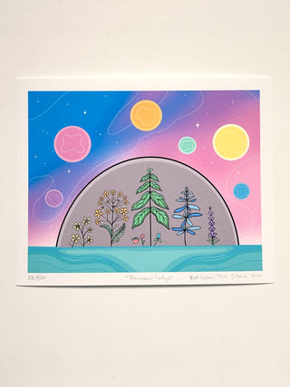 Shawn’s art is influenced by their love and relation to the land and their ancestors. They create bright colourful land based art, that embodies a fluid and infinite way they see the cosmos, animals, plant medicines, water and ancestors. Shawn creates art where love, joy and connection can be felt, and where we can engage in deeper conversations to move beyond oneself and think about our relations with the land, each other and our future generations.
