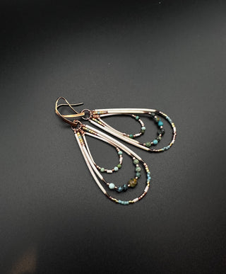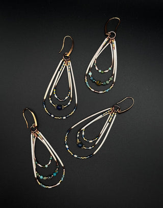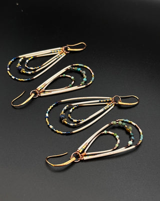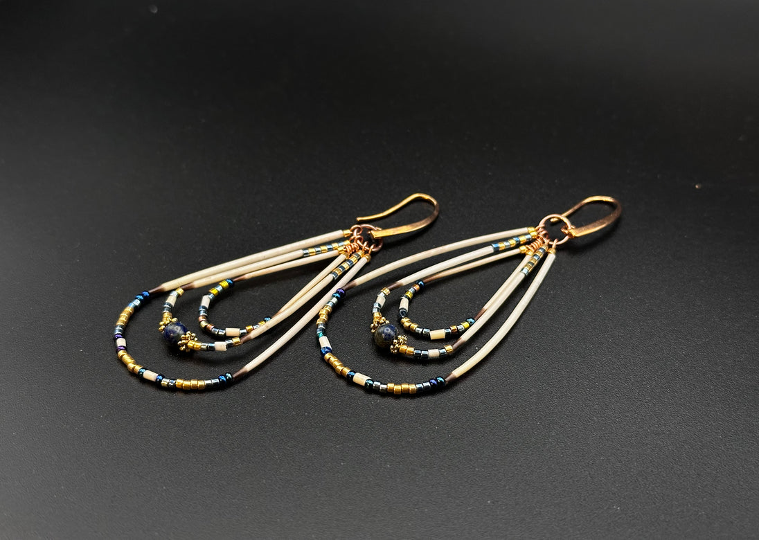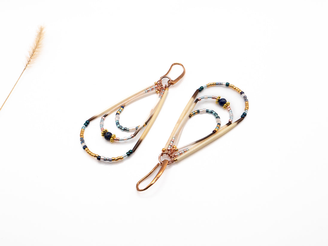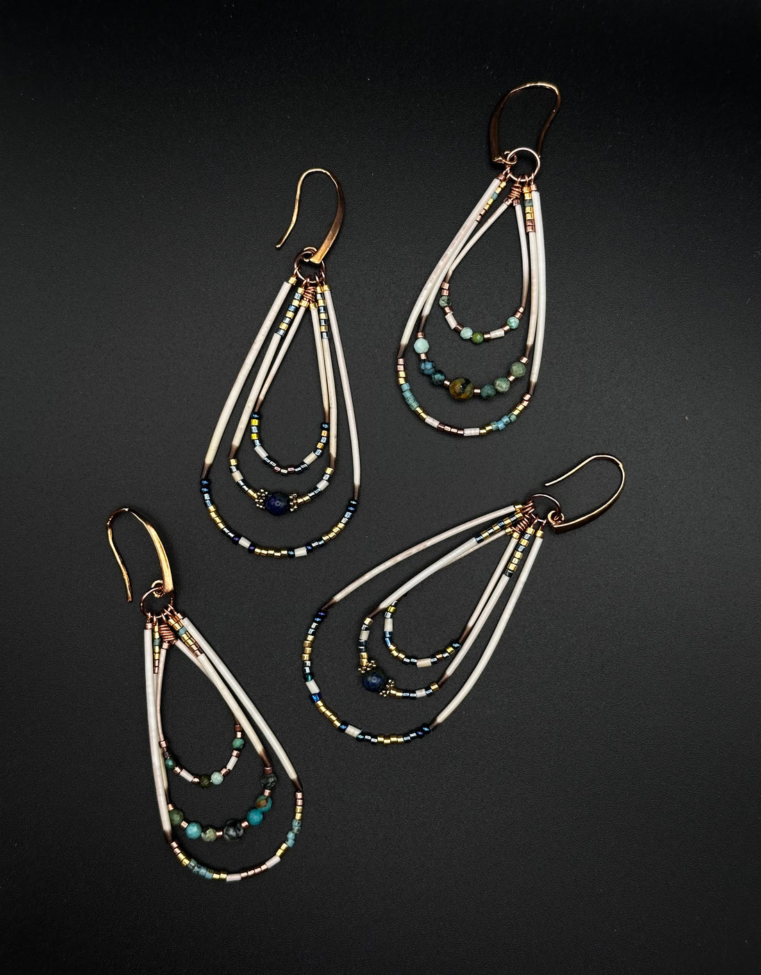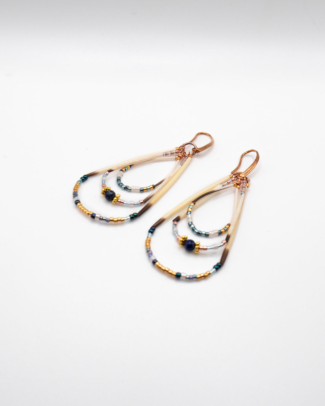 Materials: Porcupine Quill, 16mm Beads, Size 15 and 11 beads, Lapiz Lazuli, Silver Plaited Wire, Surgical Steel Hooks