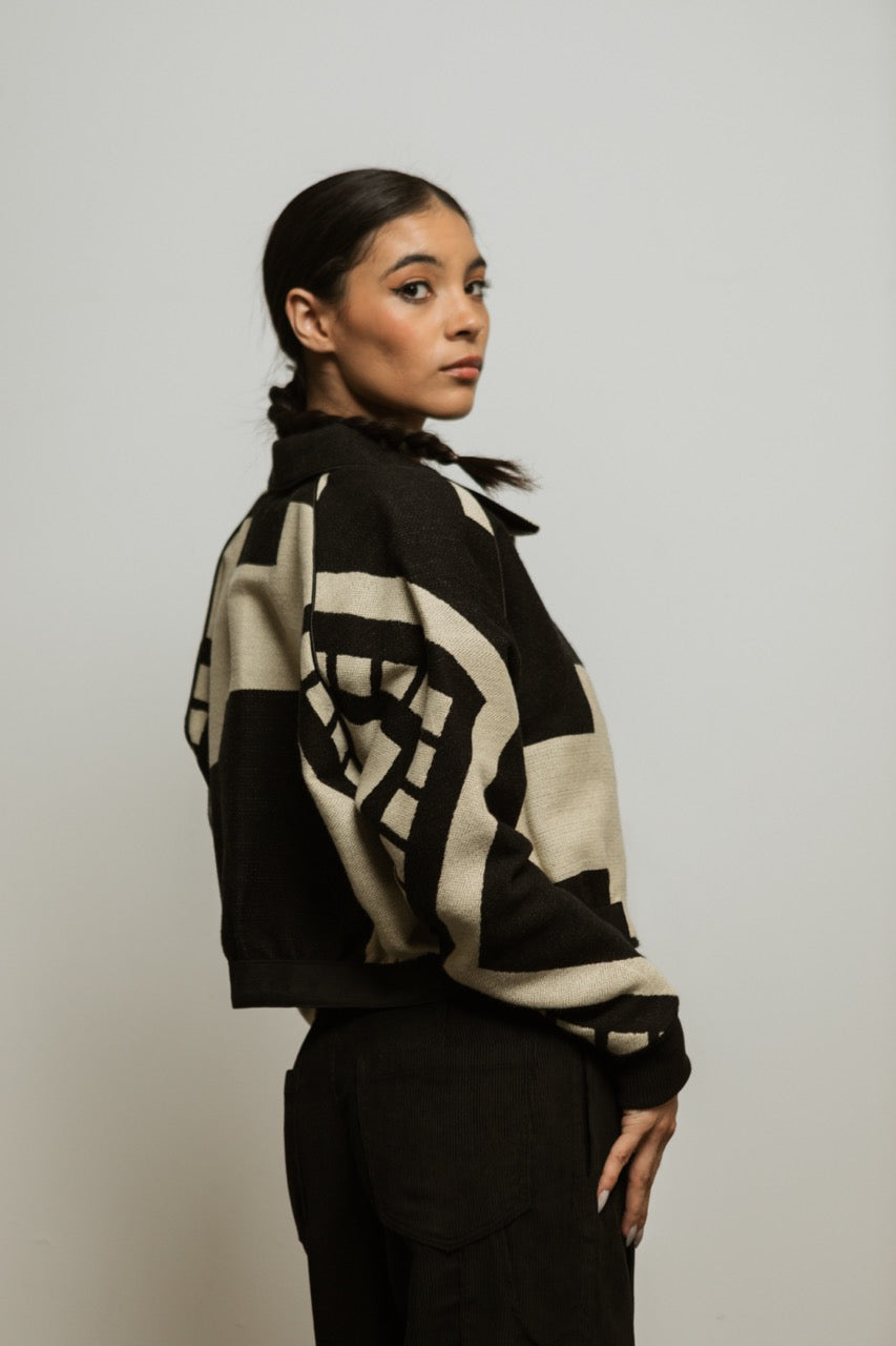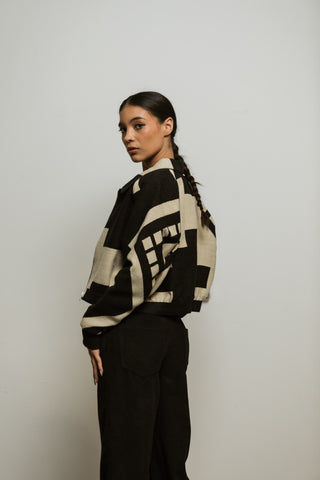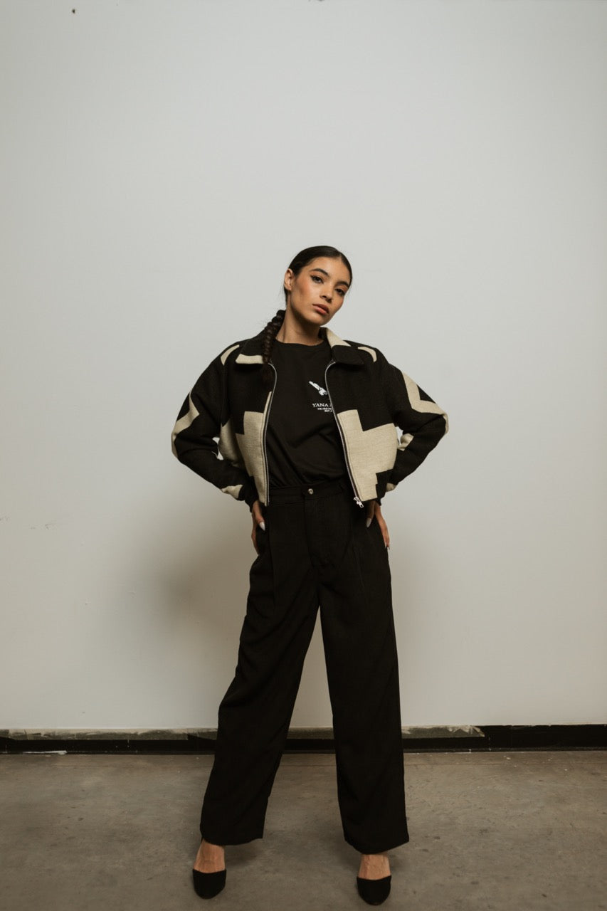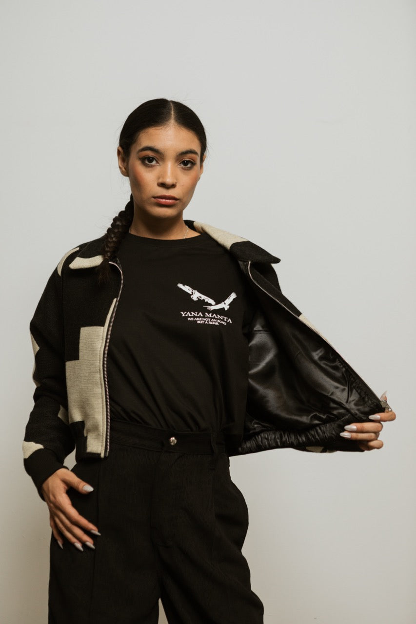 The Crop Jacket embodies Indigenous Futurism in a bold, waist-length silhouette. Designed by Yana Manta (Kinoo Arcentales Cajas) and handwoven with Kichwa families, its black-and-white geometry reflects mountains, rivers, and the Andean principle of duality—opposites working together in balance.