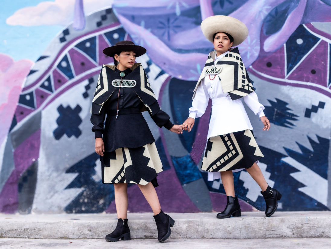 Designed by Yana Manta (Kinoo Arcentales Cajas) and woven in collaboration with Kichwa families, the textile is expressed through bold black-and-white geometry. Its layered form becomes a landscape in itself—mountains and rivers, earth and water—honoring tradition while opening new possibilities for contemporary wear.