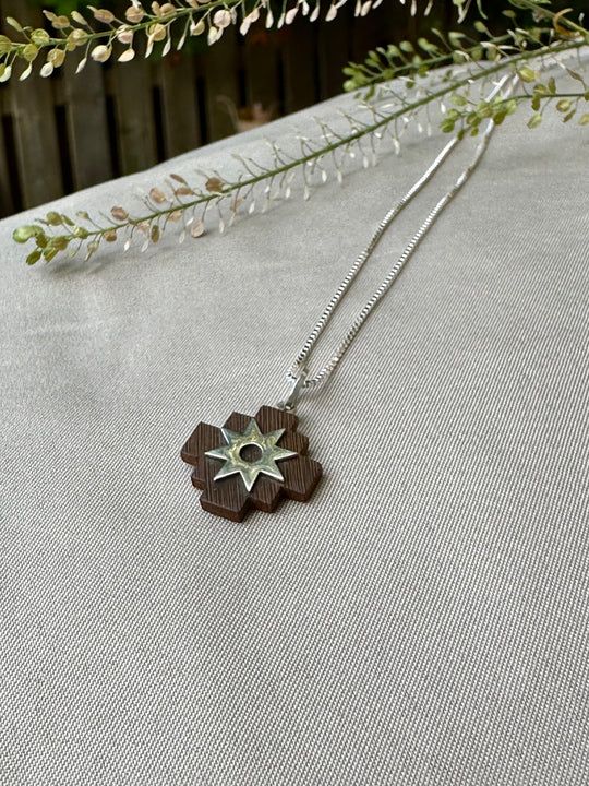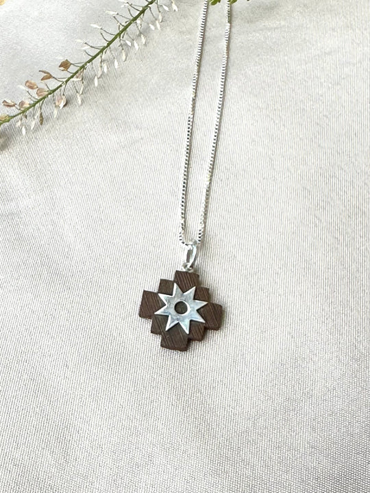 Cruz del Sur. This pendant was carefully made in Peguche, Otavalo, Ecuador by self taught Kichwa artist Pedro Maldonado. Materials: Wood & Silver 925 Dimensions: Length: 1.5 cm ( hook not incl.) Width: 1.5 cmRegular price $59.99