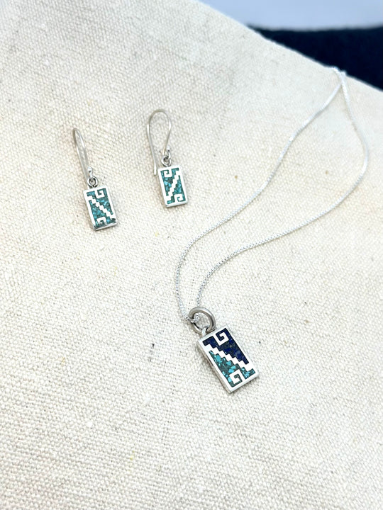 Handcrafted in Peguche, Otavalo, Ecuador by self taught Kichwa artist Pedro Maldonado. Materials: Silver 925, Turquoise & Sodalite Dimensions: Earrings Height: 1.2.cm (hook not incl.), 2.7 cm (with hook) Earrings Width: 0.7 cm Pendant...Regular price From $49.99