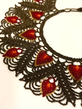 This product was made in Saraguro, Ecuador, by kichwa women who wear traditional necklaces in similar shape, but make new contemporary designs, advancing an indigenous aesthetic into a more sophisticated piece.