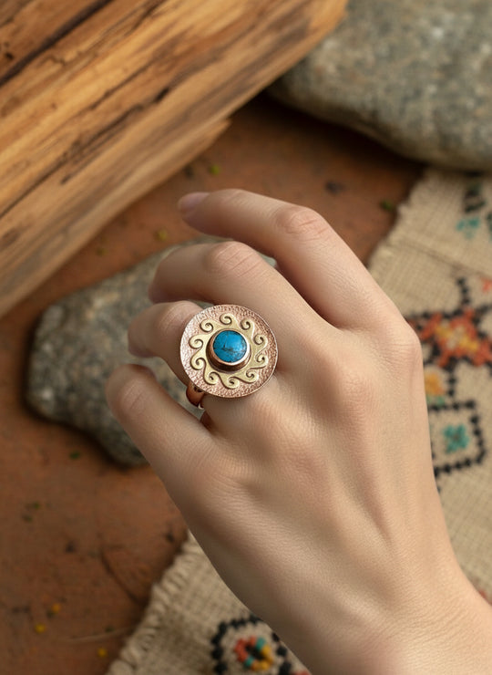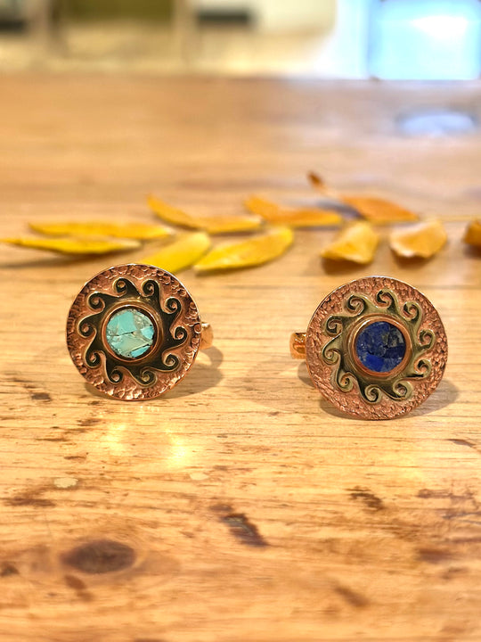 This product was carefully made in Peguche, Otavalo, Ecuador by Kichwa artist Pedro Maldonado. Materials: Copper, Turquoise, Chrysocolla, Tiger’s eye, Turmaline, Lapis Lazuli, Red Jasper, Serpentine Ring Size: A1: Size 6.5 Chrysocola, Serpentine, Jasper...Regular price $69.00