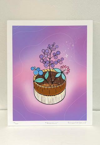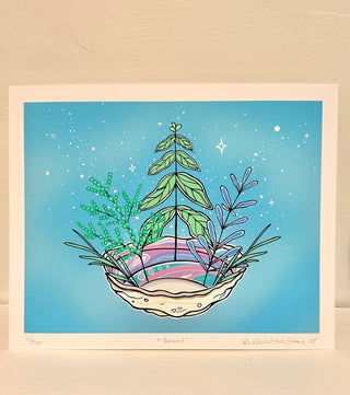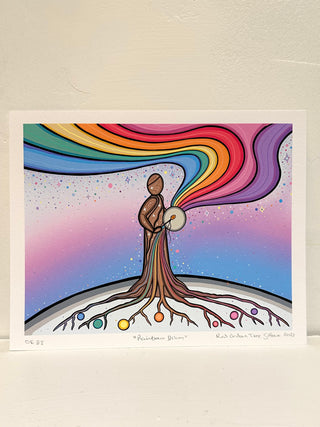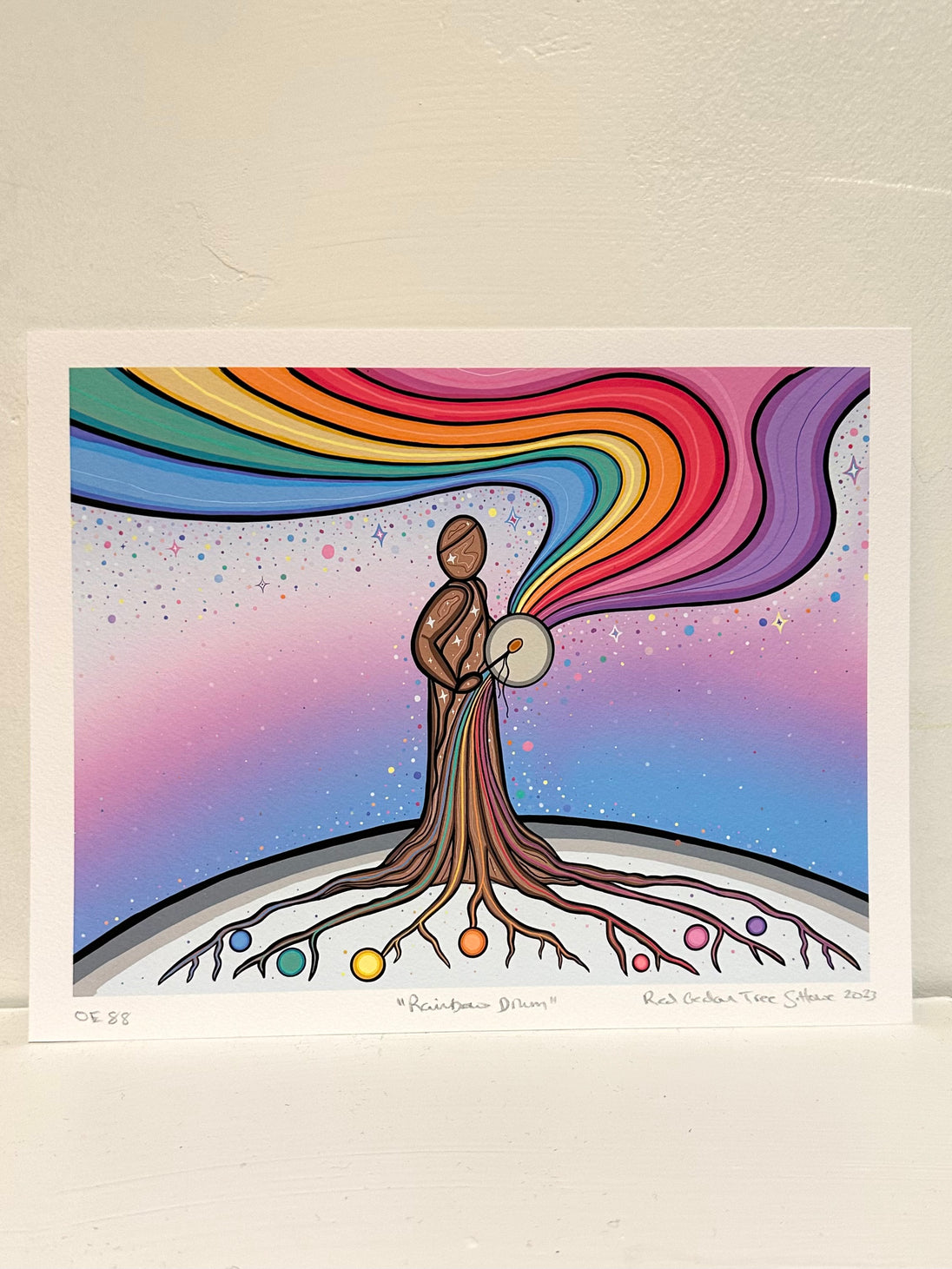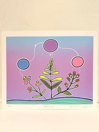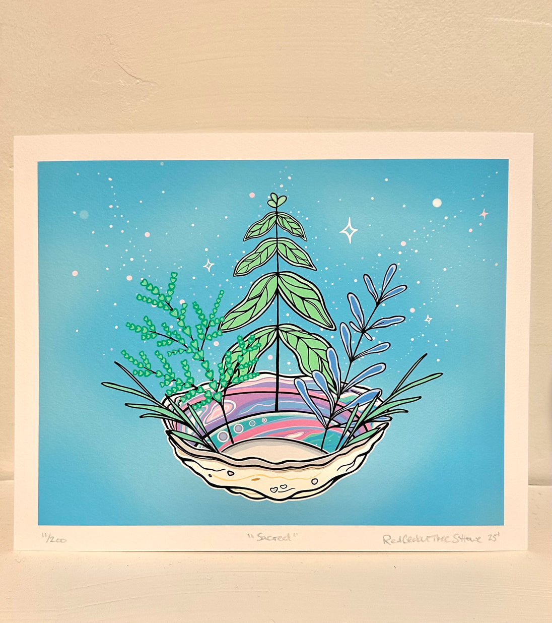 Shawn’s art is influenced by their love and relation to the land and their ancestors. They create bright colourful land based art, that embodies a fluid and infinite way they see the cosmos, animals, plant medicines, water and ancestors. Shawn creates art where love, joy and connection can be felt, and where we can engage in deeper conversations to move beyond oneself and think about our relations with the land, each other and our future generations.